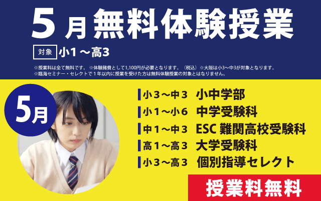 ※授業料は全て無料です。※体験諸費として1,100円が必要となります(税込) 。※大阪は小3~中3が対象となります。※臨海セミナー・セレクトで1年以内に授業を受けた方は無料体験授業の対象とはなりません。