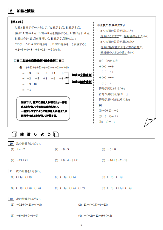 これまでの計算に加えて符号の判断が必要になるため、つまずきやすく、それでいて中学校での学習の基礎になる重要な単元です。