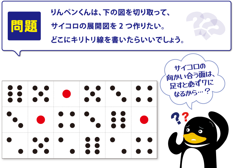 サイコロの展開図においては、3つの面が一列に並んだ時、「隣の隣」の位置にある面が組み立てた時の向かい合う面となります。展開図上で3つの面が並んでいない場合でも、組み立てた時に重なる辺を探す事で「隣の隣」になる面を見つけることができます。