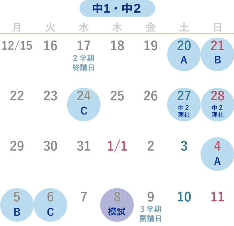※ABCの記号は英語・数学・国語のいずれかの教科と対応いたします。どの記号がどの教科になるかはクラスによって異なりますので、お申し込み後にご面談やお手紙等で別途ご案内いたします。
