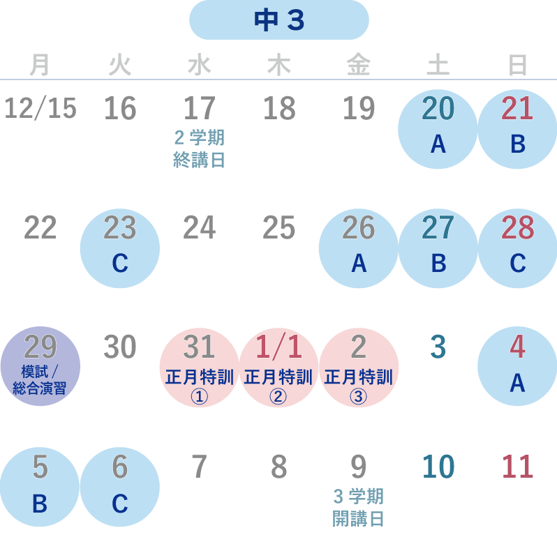 ※ABCの記号は英語・数学・国語のいずれかの教科と対応いたします。どの記号がどの教科になるかはクラスによって異なりますので、お申し込み後にご面談やお手紙等で別途ご案内いたします。なお、中3生は英語・数学・国語の授業の前に理社の授業がございます。