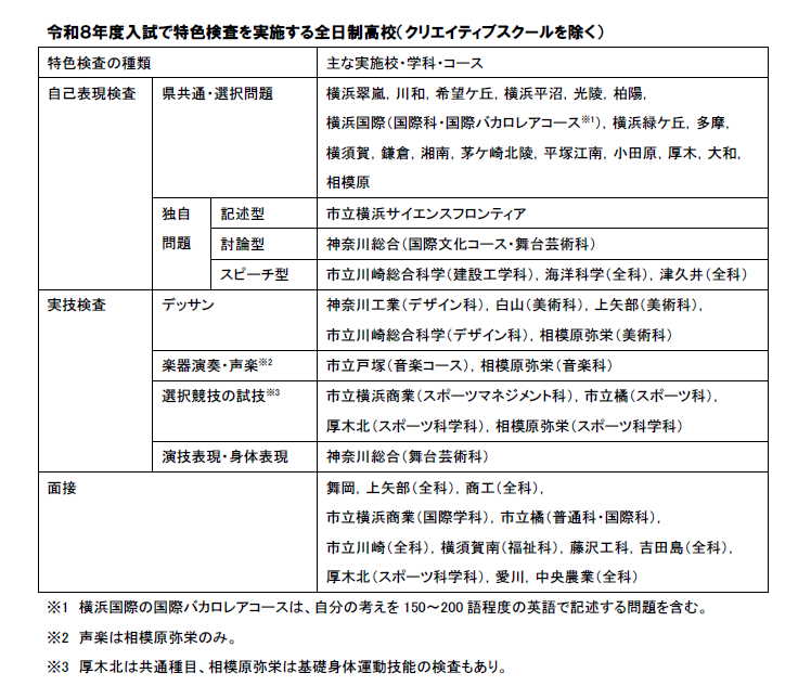 ※1 クリエイティブスクール(青葉総合(田奈・麻生総合の統合校)、釜利谷、横須賀南の普通科、小田原北(小田原城北工業・大井の統合校)の普通科、大和東)は、学力検査を実施しません。