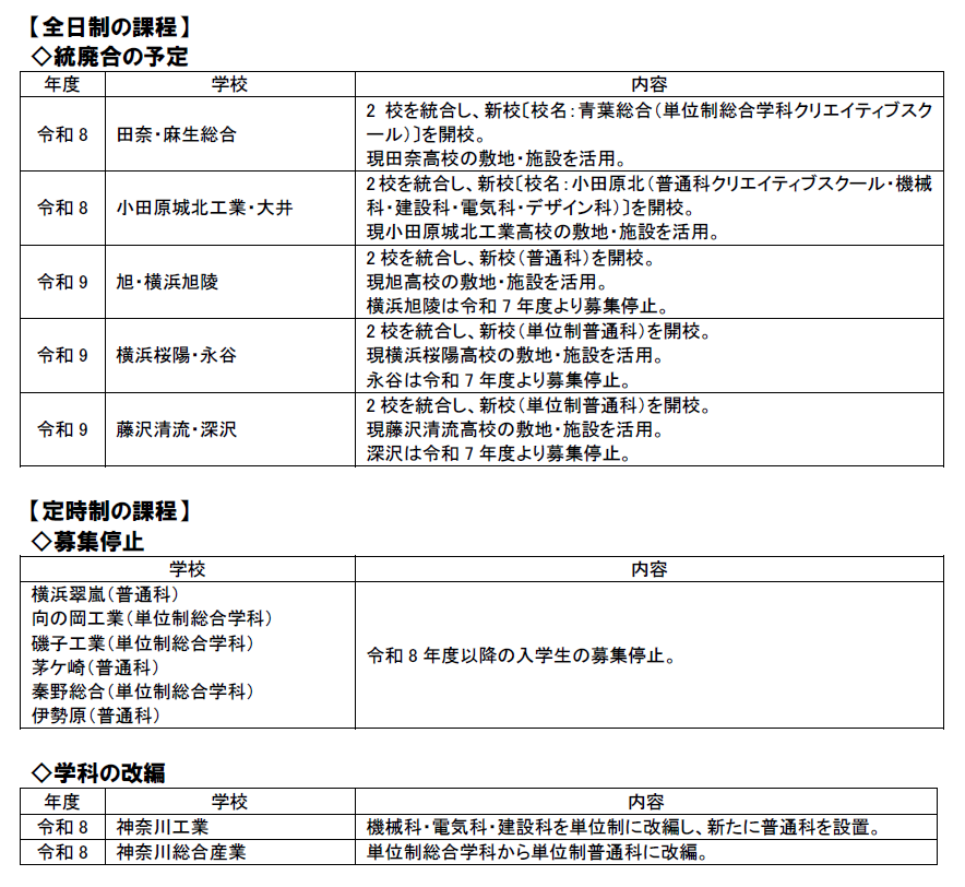 神奈川県公立高校で令和8年度以降に統廃合・学科の改編や入試の変更が予定されている学校は下記の通りです。