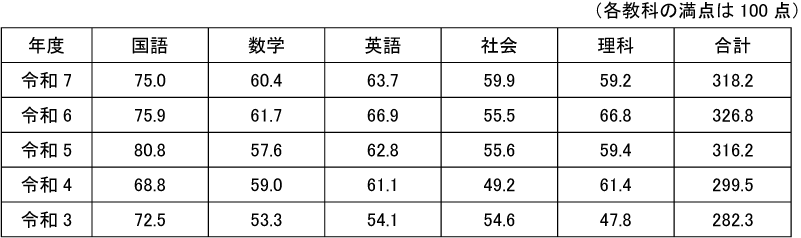また、過去5年間の5教科の受験者平均点は、下表のとおりです。