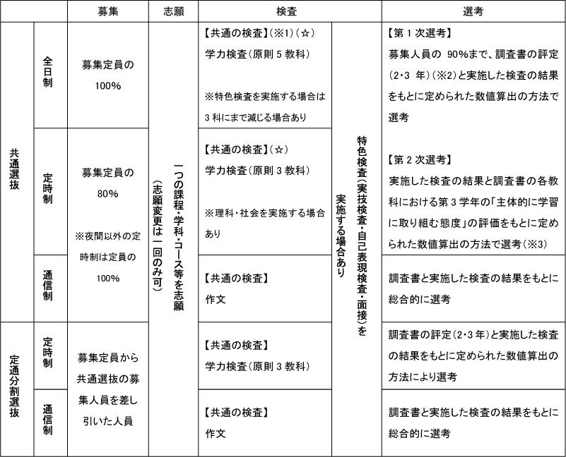 | 【共通選抜の二次募集】 欠員がある場合、必要に応じて実施されます。 検査は学力検査(3教科)に加え、特色検査のうち面接を実施する場合があります。 調査書と実施した検査の結果をもとに総合的に選考されます。 |