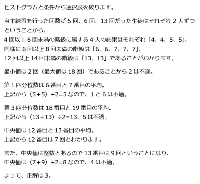 問3は、相似な図形の証明のほか、円と相似、データの活用、平面図形についての出題がありました。データの活用については、ヒストグラムや条件から最大値・最小値・第1~3四分位数を把握することで例年に比べ正しい選択肢を選びやすい問題でした。平面図形の問題は三平方の定理や相似な図形を利用して次々と長さを求めていくことで面積を求めるのに必要な情報が手に入る問題でした。