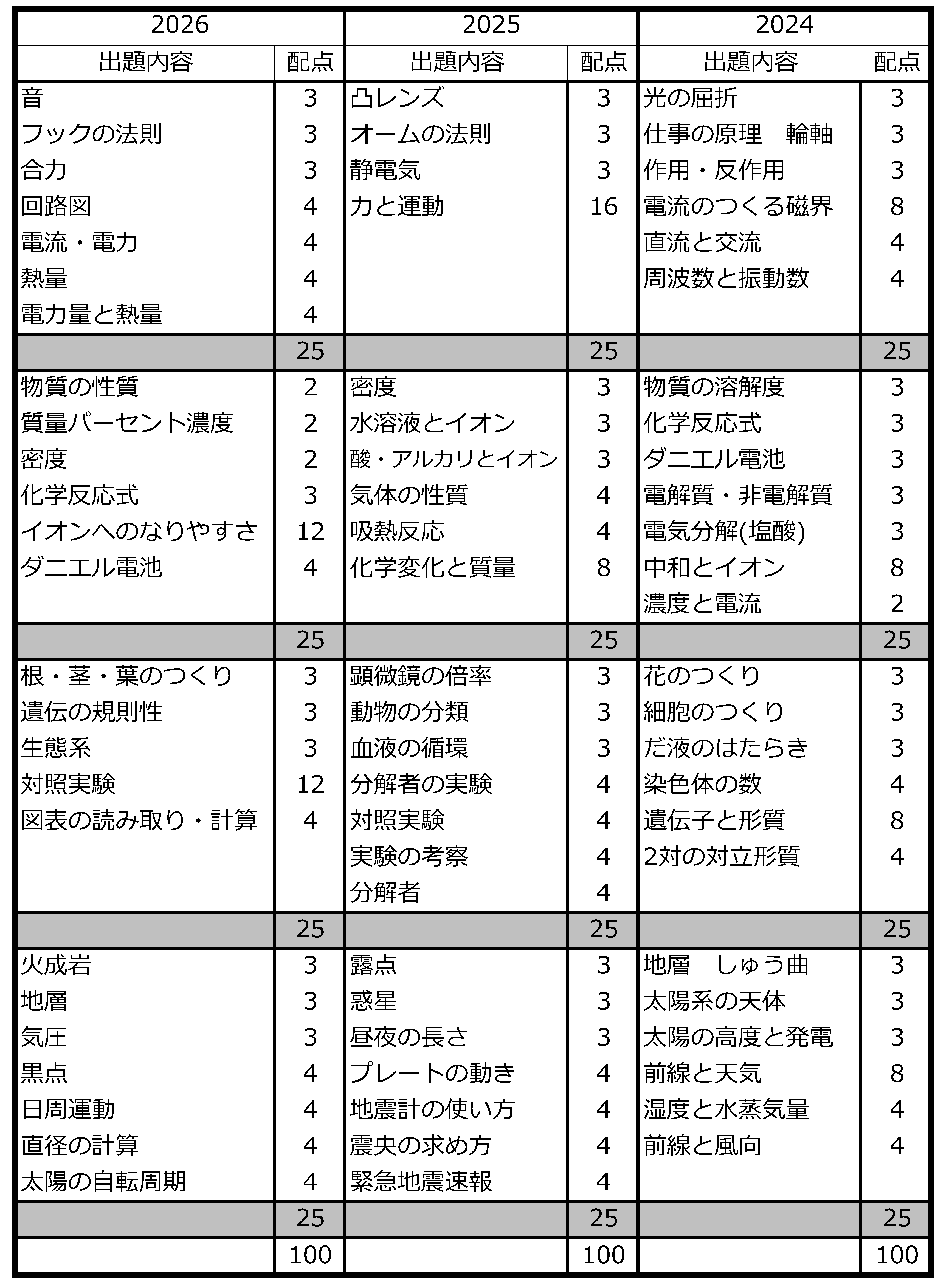 【地学分野】 火成岩、地層、気圧、太陽からの出題でした。問4(ウ)では、気圧と気温により空気が膨張するか収縮するかを判断する問題が出題されました。問8では、太陽や天体の基本知識が問われつつ、直径の計算や自転周期など、表や問題文を読み取る力が問われる問題が出題されました。