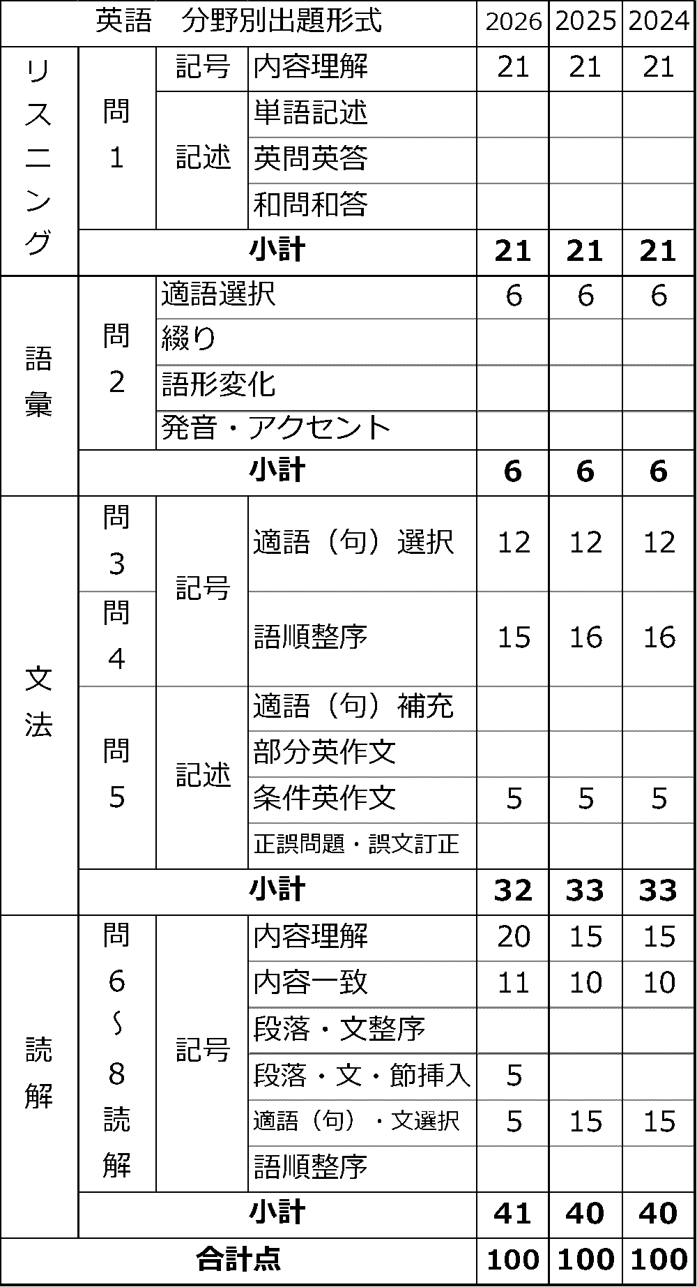 大問構成は昨年度と変わらず8題構成でした。文法や語彙、読解などを総合的にはかる問題で、単語や文法の暗記だけでなく、実際の出題形式に対応する力が求められました。