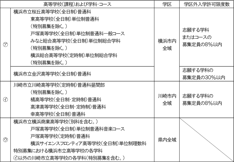 県立の高等学校と横須賀市立の高等学校には通学区域(以下「学区」といいます。)はなく、県内のどこからでも志願できます。横浜市立および川崎市立の高等学校への志願に際しては、横浜市立高等学校通学区域規則および川崎市立高等学校の通学区域に関する規則(以下「各通学区域規則」といいます。)によって、次表のように学区を設けている学校があります。学区外からの志願も可能ですが、学区外から志願する際には、入学を許可される人数の制約があります。