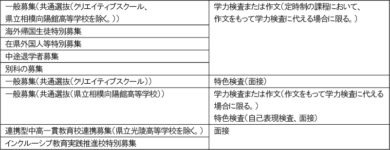 なお、クリエイティブスクールと通信制の課程では学力検査は実施せず、クリエイティブスクールでは特色検査(面接)を、通信制の課程では作文を「共通の検査」として実施し、調査書と併せて総合的に選考します。
