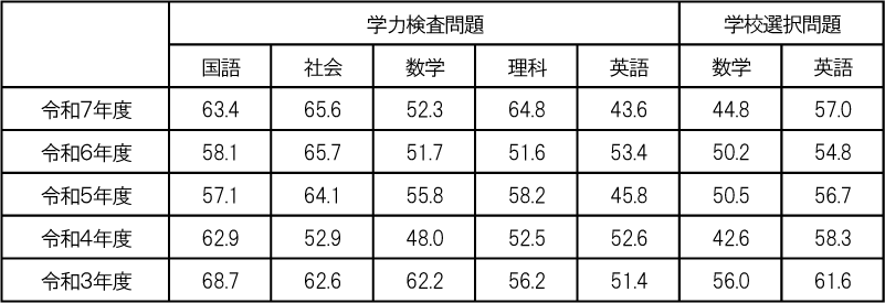 学力検査は国語・社会・数学・理科・英語の5教科で、英語にはリスニングテストがあります。検査時間は5教科すべて50分です。過去5年間の入学者選抜における学力検査の5教科の平均点は下記のとおりです。なお、学校ごとの平均点や合格者最高点・最低点等については非公表となっています。