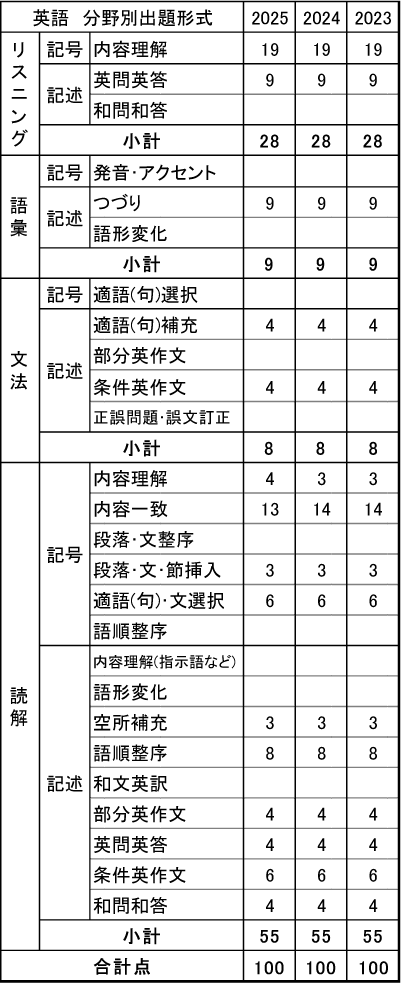 入試の問題形式は様々で、リスニング、文法、読解、英作文など、総合的な力が問われます。過去の入試問題や似た形式の問題を繰り返し解くことが効果的です。英文の内容を理解していないと正答できない問題が多いので、文章を速く正確に読む力をつける必要があります。教科書のリーディングのページなど語数の多い英語の文章を、全体の内容を把握しながら読み進める練習をしておくとよいでしょう。英作文は数多く問題を解いて添削してもらい、英文を書く力をつけていきましょう。
