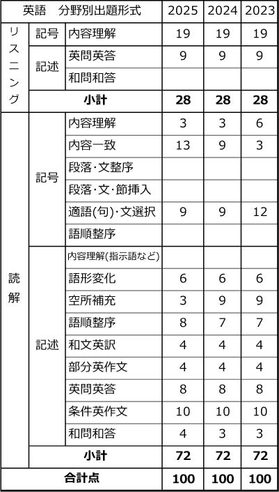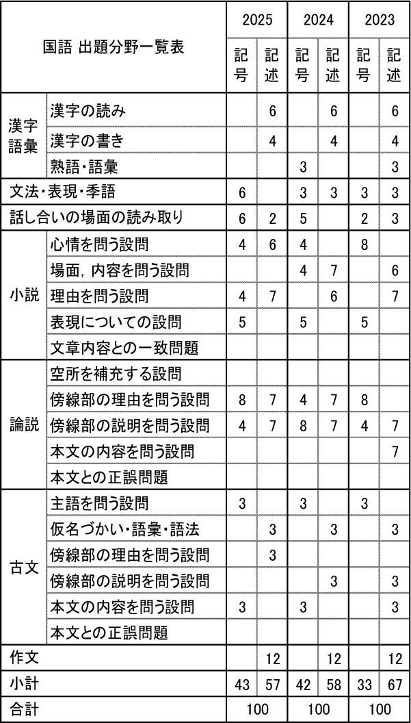 記述問題が多く、200字程度の作文もある分、文章を速く正確に読む力が必要です。漢字は、小中学校で学習したものの復習を行いましょう。文法や語彙などは、中学校で学習する内容が幅広く出題されるため、定期テストなどに合わせて復習し、知識を定着させましょう。小説文では登場人物の心情の変化を把握しながら読む練習を、論説文では段落ごとの内容を把握し、指示語や接続語に気をつけながら読む練習を重ねることが大切です。古文については、「誰が何をしたのか」を把握しながら文章を読む練習を重ねましょう。作文は、実際に過去問など類似の条件に沿って書き、添削をしてもらいましょう。資料(特にグラフ)を読み取り、自分が主張したいことを明確にし、その主張の根拠となるような自分の経験を書く練習を行いましょう。