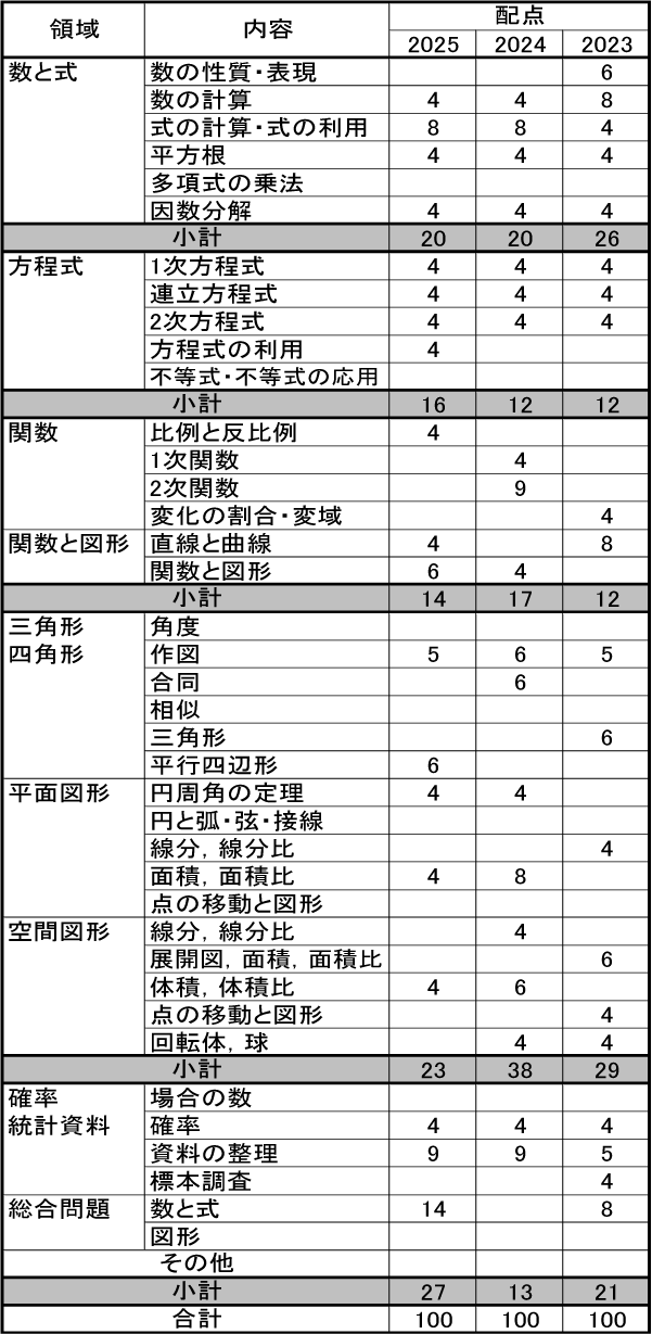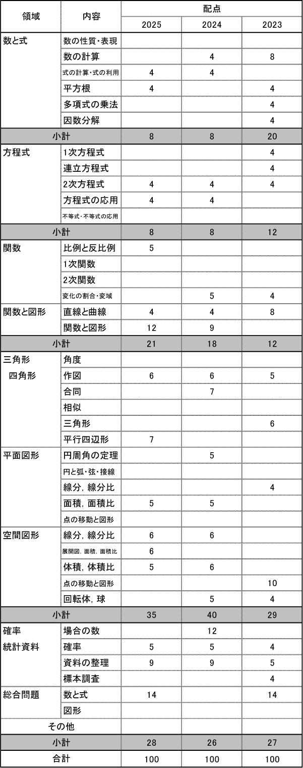 大問1は小問集合で全16題、65点分の配点でした。計算や方程式の解法から8題のほか、反比例の式、円周角、四分位数、正四角錐の体積、確率、おうぎ形と三角形の面積、方程式の利用、相対度数からの出題でした。正四角錐の体積の問題や、おうぎ形と三角形の面積の問題では、どちらも単純に公式に当てはめるだけでなく、補助線を引いて高さを求める必要がありました。