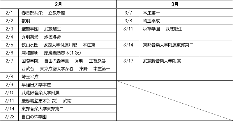 | 郁文館(iP) 上野学園(演奏家) 開成 かえつ有明 学習院 巣鴨 青稜 玉川学園 多摩大学附属聖ヶ丘 帝京大学 東京都市大学等々力 桐朋 八王子学園八王子 広尾学園 朋優学院(TG) 立教池袋 |