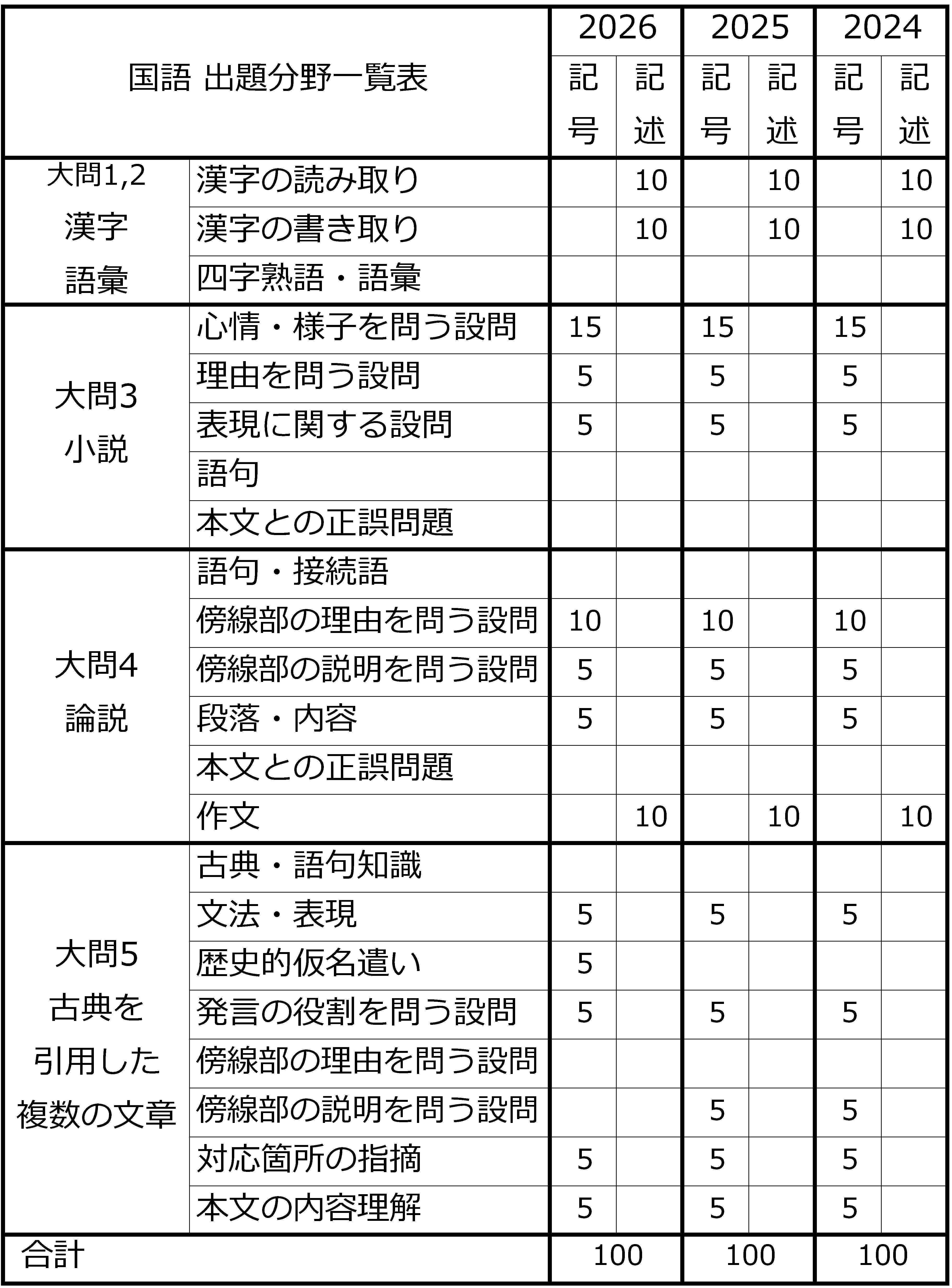 例年と同様、大問5題、小問25題の構成で、記述型の設問は漢字と200字作文のみでした。